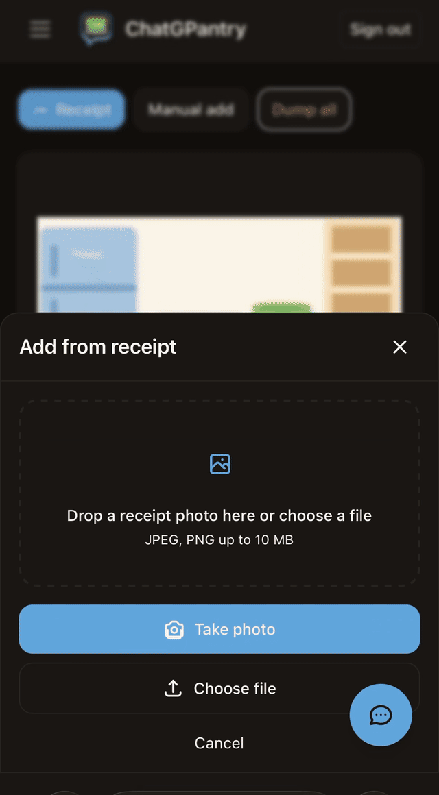 Upload a receipt—we extract items and add them to your inventory. Skip manual entry after shopping.