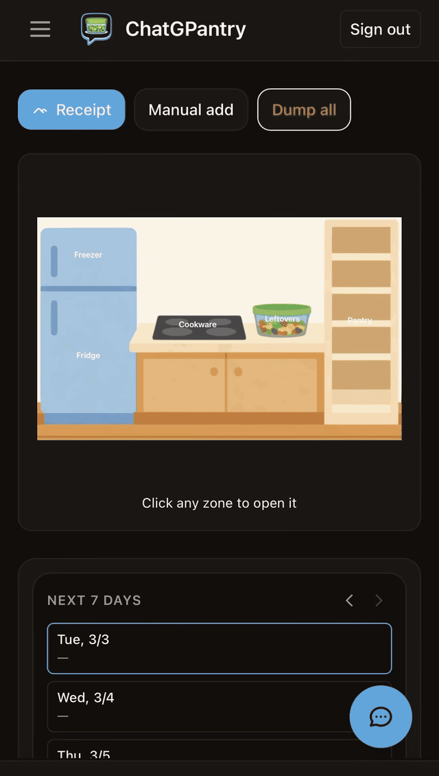 Chat for meal ideas or full recipes. We only suggest dishes you can make with what you have and update inventory when you cook.